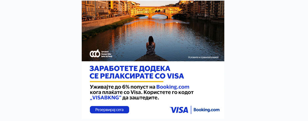 Користете ја вашата ЦКБ Visa картичка за да го резервирате следниот престој на Booking.com и уживајте до 6% попуст.
