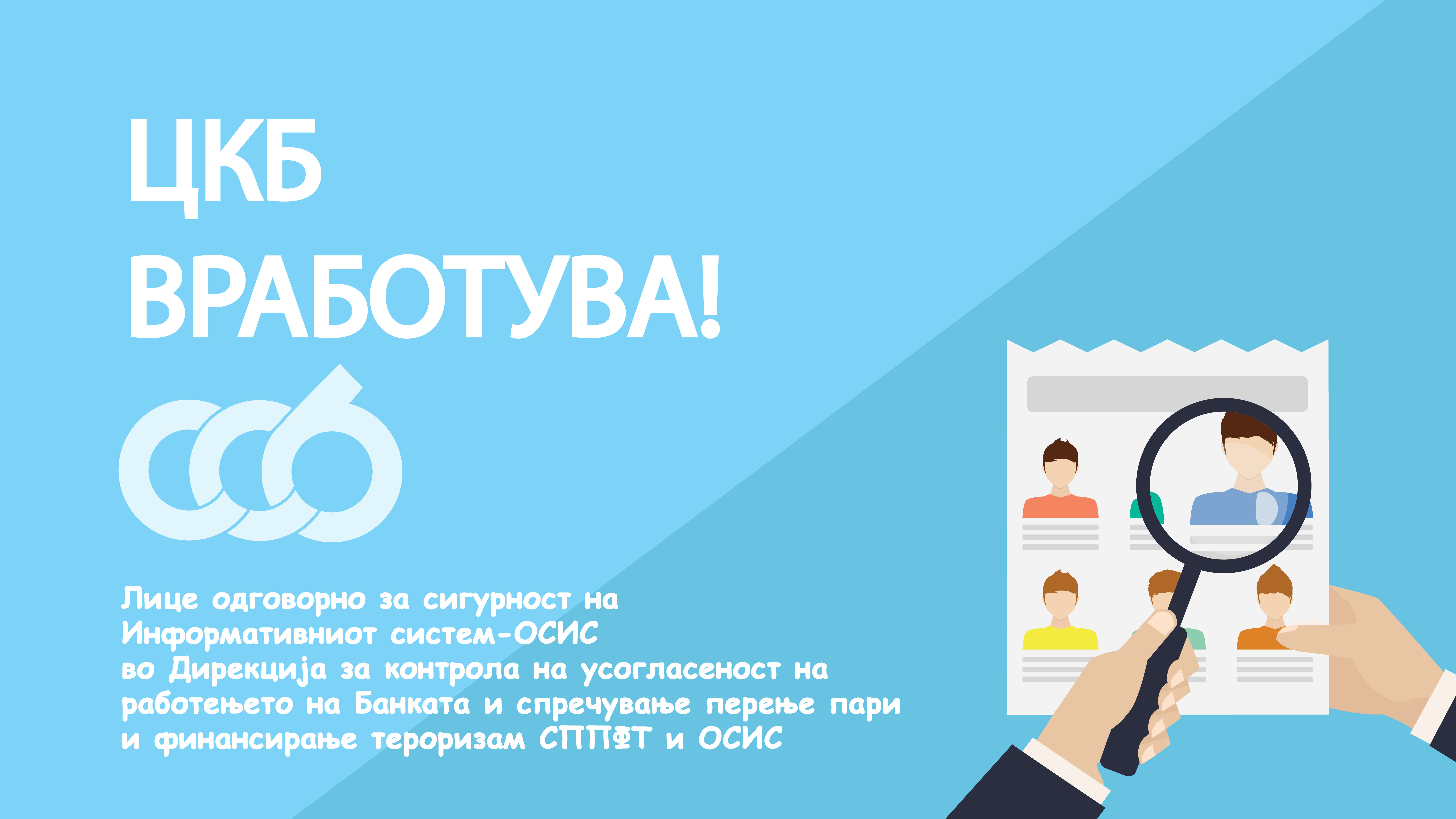 Централна кооперативна банка АД Скопје вработува кандидат за работнo местo: Лице одговорно за сигурност на Информативниот систем - ОСИС воДирекција за контрола на усогласеност на работењето на Банката и спречување перење пари и финансирање тероризам СППФТ и ОСИС.