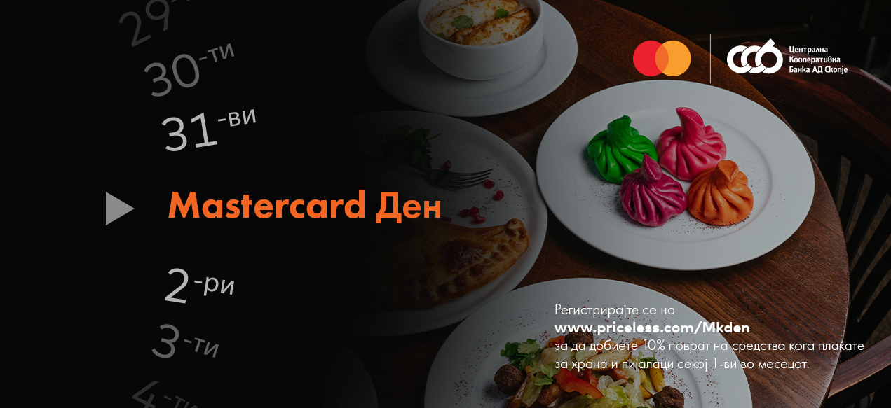 💳 Уживај во 10% поврат на средства секој 1-ви во месецот за храна и пијалаци со твојата ЦКБ Mastercard картичка.