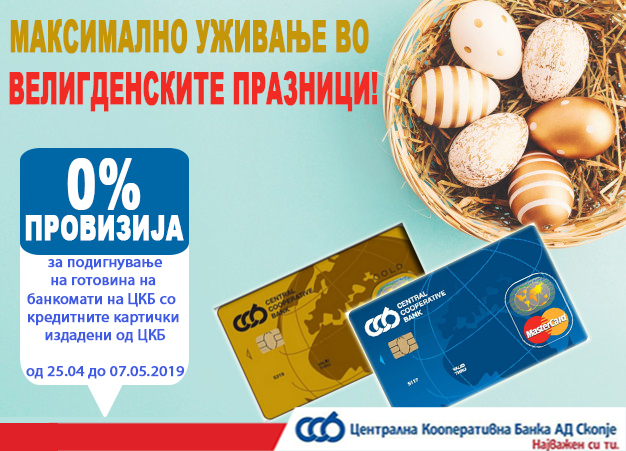 Ве известуваме дека во периодот од 25.04.2019 до 07.05.2019 година, подигнувањето на готовина на банкоматите на банката - со Вашите кредитни картички издадени од ЦКБ АД Скопје, ќе биде БЕЗ ПРОВИЗИЈА.
